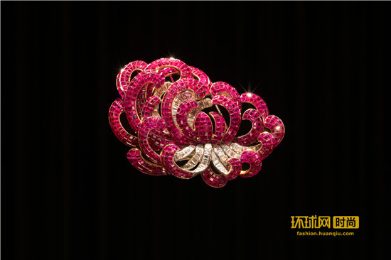 Peony胸针是凝聚20世纪30年代Van Cleef & Arpels梵克雅宝匠心艺术的大成之作。这款作品镶嵌有长方型切割钻石、圆形钻石以及640颗运用隐密式镶嵌工艺的方形缅甸红宝石。隐密式镶嵌工艺是Van Cleef & Arpels梵克雅宝原创标志性工艺,于1933年获得专利。这件臻品最初的设计是一对双花胸针,原为埃及法伊莎(Faiza)公主殿下所珍藏。