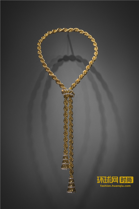 凭借复杂而精湛的制作工艺(缠绕、编织、盘绕),黄K金在项链、胸针、耳饰与手链的创作中无处不在,与其它材质形成鲜明对比。抛光后的黄K金以极简工艺运用于钻石镶嵌亮片,而黄K金珠串饰件则与珍贵宝石相辅相成。织物依然是Van Cleef & Arpels梵克雅宝设计创作的灵感之源。缕缕耀眼的纯金丝线无不与作品中展现平行的线条之美,宛若“天使的发丝”或V形臂章,与珍贵宝石浑然天成。例如,Serge系列便采用别致优雅的织物纹理设计,而垂于一侧的缎带则渲染出一种不羁的另类时尚。战后,珠宝界经典设计风潮再次来袭。