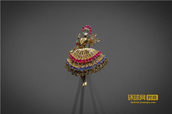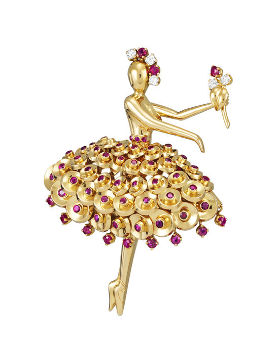 1940年,Van Cleef & Arpels梵克雅宝在纽约打造了首批芭蕾舞伶胸针。1942年,位于巴黎的工作室向经典致敬,继续创作芭蕾舞伶胸针。这枚诞生于1953年的胸针以黄K金珠片装点舞者的华美芭蕾裙摆,并镶嵌红宝石,凸显舞者的曼妙舞姿。