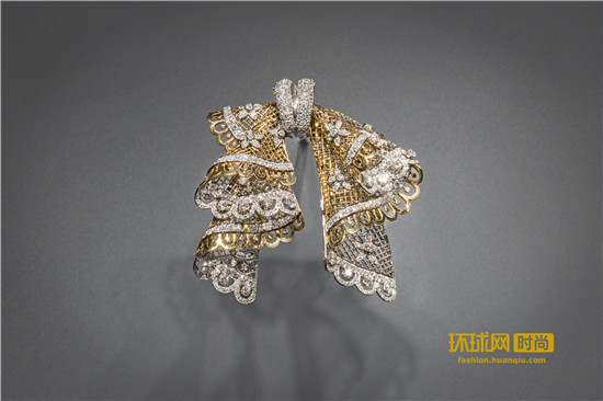 同时,黄K金摇身变为珠宝饰品的“金纺线”,“编织”出包括人字纹带、平针织物、薄纱、网格、滴珠、绳结与蝴蝶结等精美配饰。整个20世纪40年代,蕾丝蝴蝶结盛极一时,抛光镂空黄K金与钻石配饰交相辉映,展现出作品如同蕾丝般的细腻精巧。