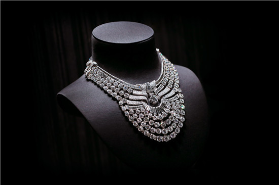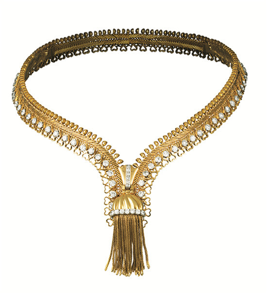 这款项圈原为埃及纳丝莉(Nazli)王后珍藏,当时为参加女儿法丝娅(Fawzia)公主与伊朗王储穆罕默德•礼萨•巴列维(Mohammed Reza Pahlavi)于1939年3月16日举行的大婚典礼而特别定制。这款珍品由673颗重达204.03克拉的长方型切割钻石和圆形钻石构成。钻石如流水般顺流而下并由两条丝带状设计元素加以修饰,在项圈中心重约6克拉的璀璨钻石处交汇。