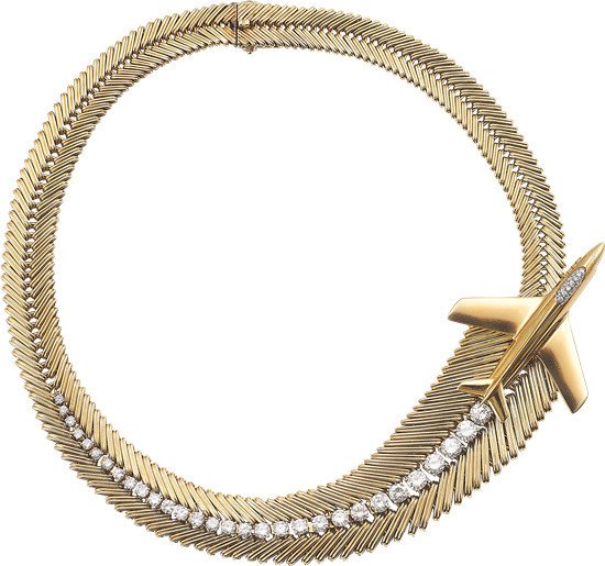 1956年,法国飞机制造商达索公司将这款项链送给法国第一位女性试飞员杰奎琳•奥里奥尔(Jacqueline Auriol)。这件臻品由黄K金打造,并镶嵌钻石。Van Cleef & Arpels梵克雅宝以编织工艺为灵感源泉,创造出轻盈灵动的网格设计。钻石由大至小排列,仿佛飞机在天际划出钻石般璀璨的轨迹,再现了她驾驶Mystère IV飞机的传奇航程。