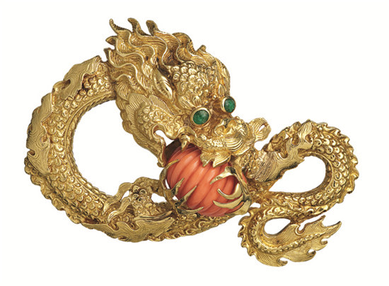 Van Cleef & Arpels梵克雅宝创立伊始便率先推出了 à l’Orientale 珠宝系列,成为将东方文化融入西方设计的先驱之一。 这枚创作于1969年的龙型胸针旨在致敬这一传说中的东方神物,作品生动再现祥龙戏珠的这一传神的玄幻景象。鳞片状的狭长龙身由黄K金打造,凸圆型切割祖母绿装饰双眼,两爪间的戏珠则由珊瑚雕刻而成,成为胸针的点睛之笔。