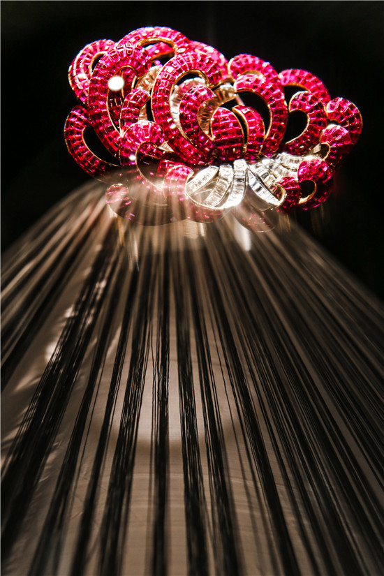 另一项饱含创意巧思的工艺是闻名遐迩的隐密式镶嵌工艺,这项工艺也在1933年获得了专利。它的秘诀在于塑造纤细的金属网格,再将经过特别切割的珍贵宝石逐颗镶嵌其中,这项工艺通常运用于镶嵌红宝石,也会用于祖母绿和蓝宝石的镶嵌。这一工艺的特别之处在于可以将镶座隐藏起来,完整展现出每颗宝石的耀目光芒,令 Boule戒指、Pivoine胸针、Plumes胸针和Chrysanthèmes胸针等代表作更为璀璨耀目。1934 年,首款柔软灵动的黄K金Ludo手链面世,最初采用方形图案,之后演化为六角形,使得手链更加柔韧灵活。